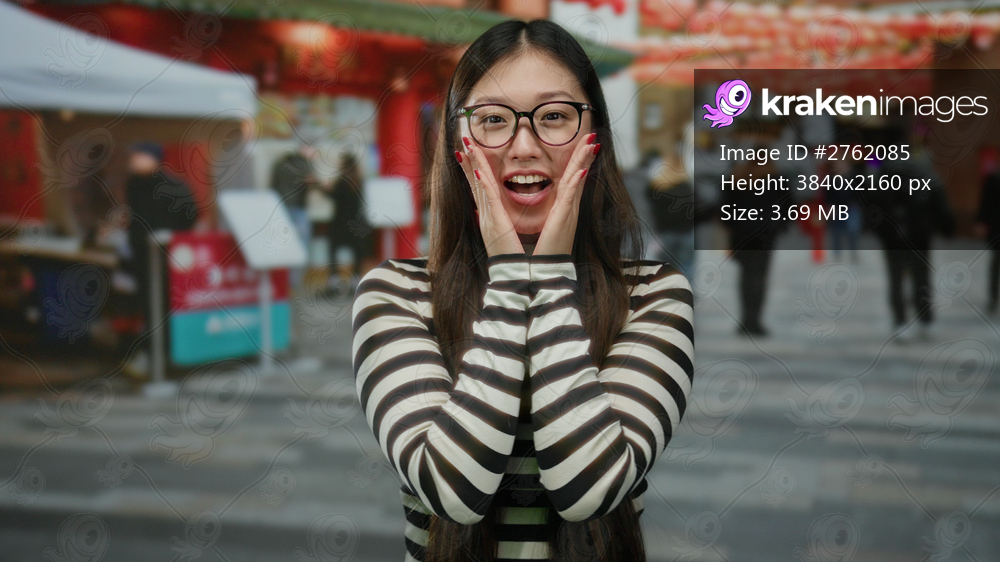 Woman with glasses on urban street smiling with joy under festive red decorations with city ambiance.