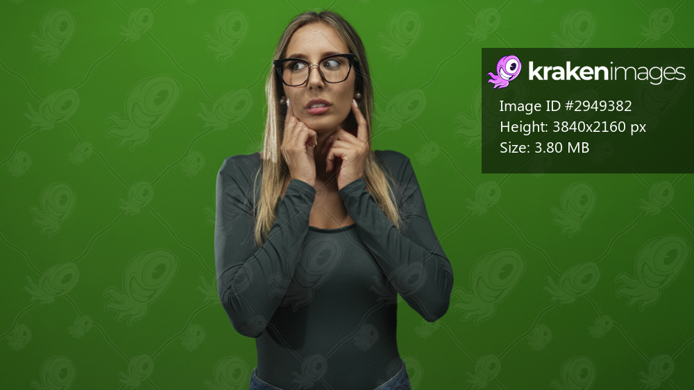 Woman with glasses placing fingers to her neck and clasping hands near chest in studio green screen, looking sideways; pensive thought.