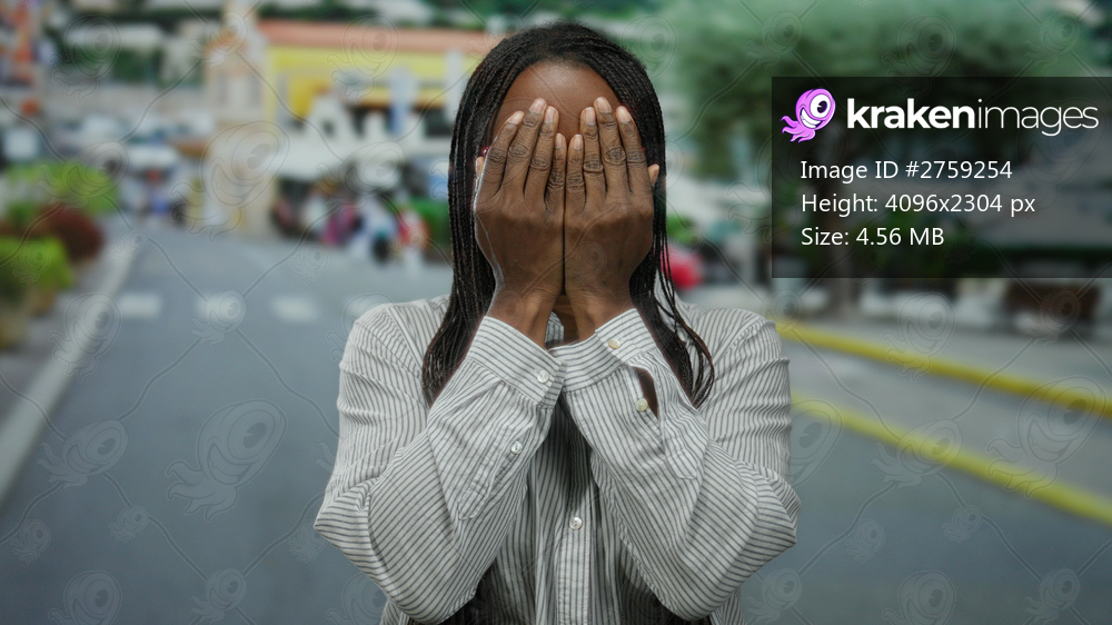 Woman with glasses playfully covers face in urban street scene, displaying expressive emotion in striped shirt against vibrant city backdrop.