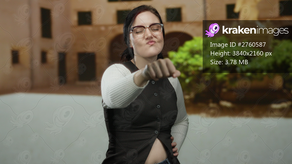 Woman with glasses playfully extends fist to camera on university campus with brick architecture and greenery in background.