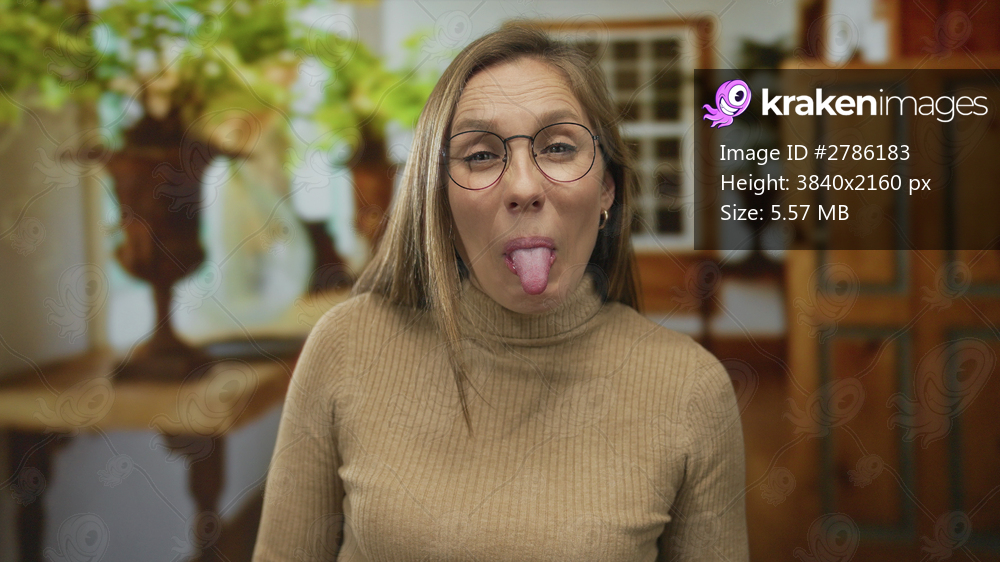 Woman with glasses playfully sticking tongue out indoors, wearing a sweater in a hotel decorated with plants.