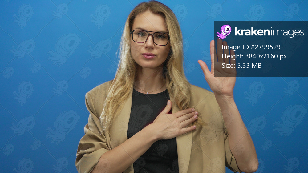 Woman with glasses pledging hand on chest against blue background, blonde hair, serious expression conveying trust or promise