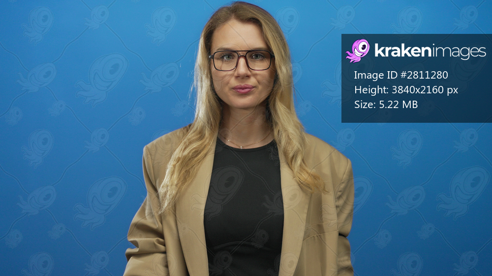 Woman with glasses pledging hand on chest against blue background, blonde hair, serious expression conveying trust or promise