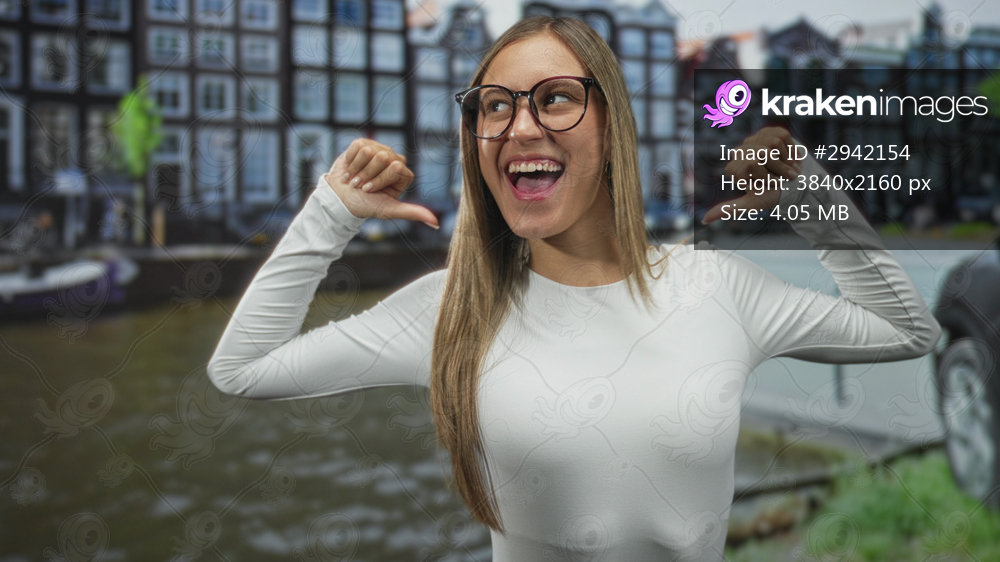 Woman with glasses pointing both thumbs to her chest on a canal street lined with narrow buildings; confidence self esteem.