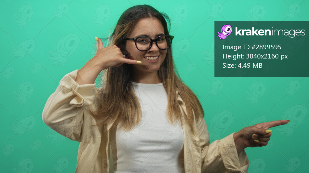 Woman with glasses pointing right with hand and making call me gesture in a green studio while wearing white top and beige shirt; playful communication. - Kraken Images
