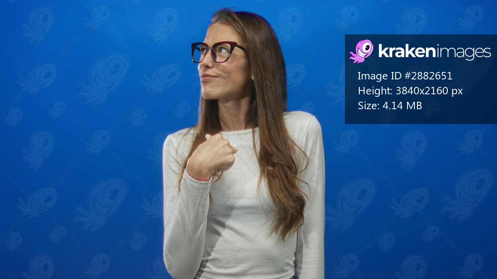 Woman with glasses pointing thumb to chest, smiling and looking aside, long hair visible against vivid blue studio wall; confidence assurance.