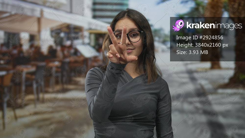 Woman with glasses points finger and outstretched hand toward camera on street terrace restaurant outdoors; confidence invitation.