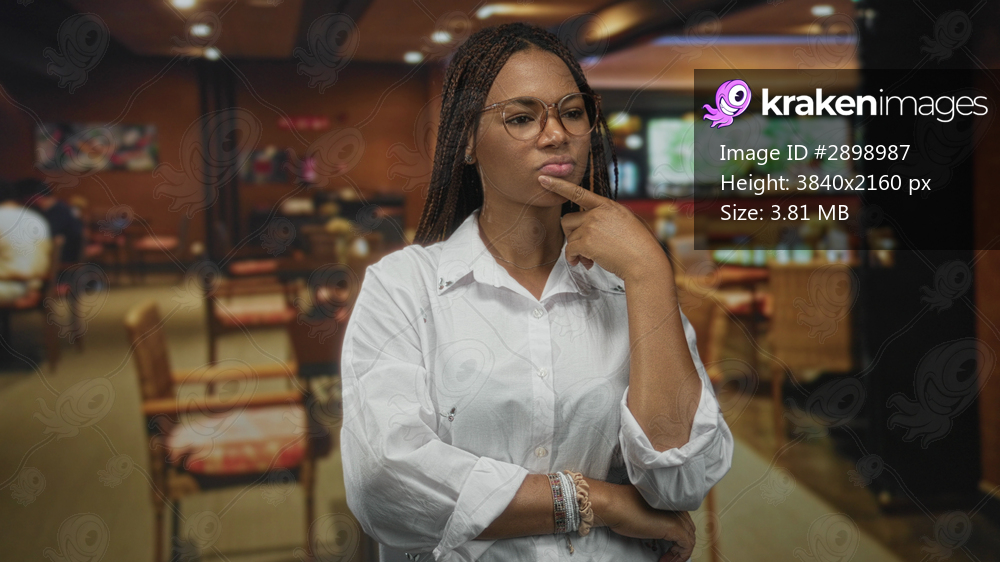 Woman with glasses points finger to chin in building dining area, wearing white shirt and bracelets; thoughtful curiosity.