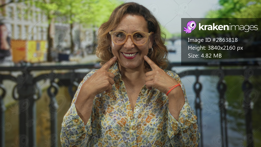 Woman with glasses points fingers to cheeks on a sunny canal street by water and bridge in amsterdam; happiness.