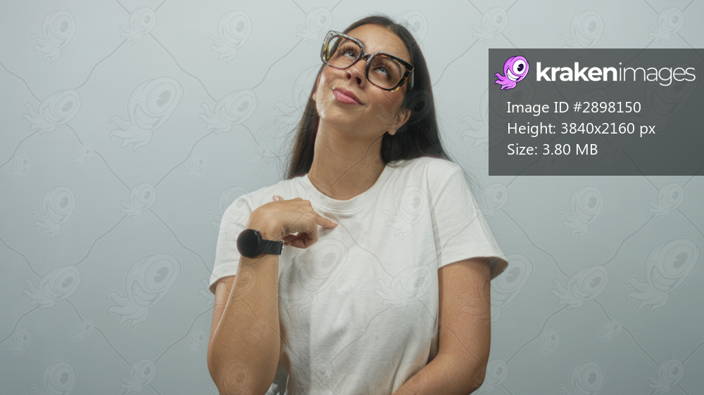 Woman with glasses points thumb to chest in studio with pale blue background; confidence self belief charm.
