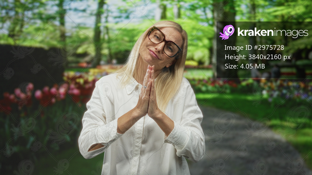 Woman with glasses presses hands together in prayer near chin, visible fingers and face, standing on a flower lined path in a forest setting; quiet hope. - Kraken Images