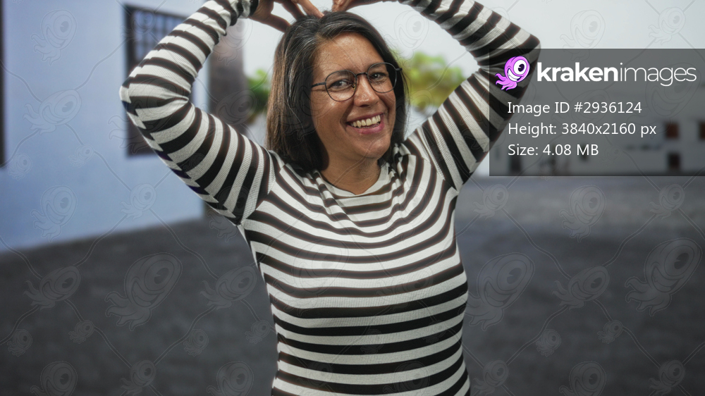 Woman with glasses raises hands into a heart above her head while smiling with eyes closed in a white building street courtyard; joy confidence.
