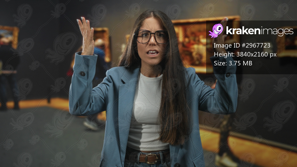 Woman with glasses raises her hands toward framed paintings in a museum building while speaking and gesturing openly; surprise curiosity.