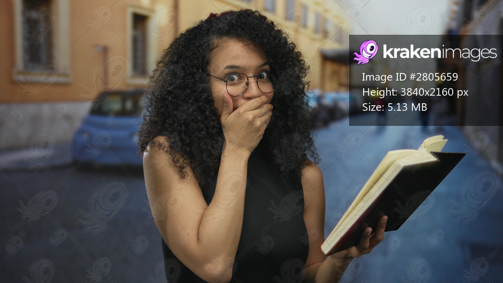 Woman with glasses reading book outdoors on bustling street showcasing joyful expressions under bright urban setting