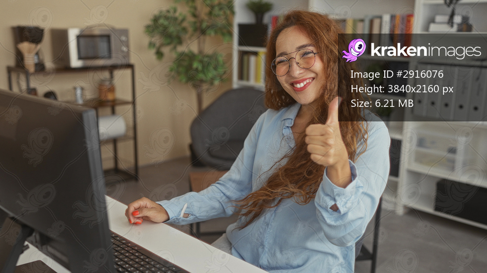 Woman with glasses and red nails typing on keyboard, smiling and giving thumbs up at desk in building; work confidence.