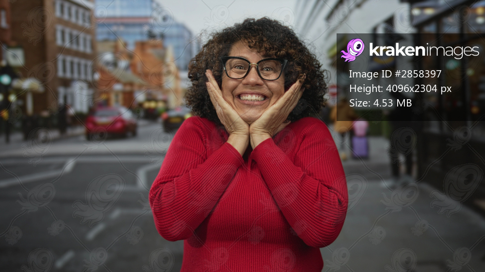Woman with glasses and red sweater raises hands beside her head while smiling on a busy city street; happiness.