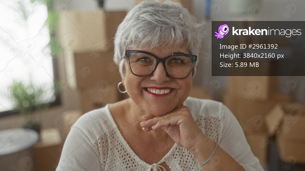 Woman with glasses resting chin on hand, smiling among cardboard moving boxes inside a building; contentment new home.