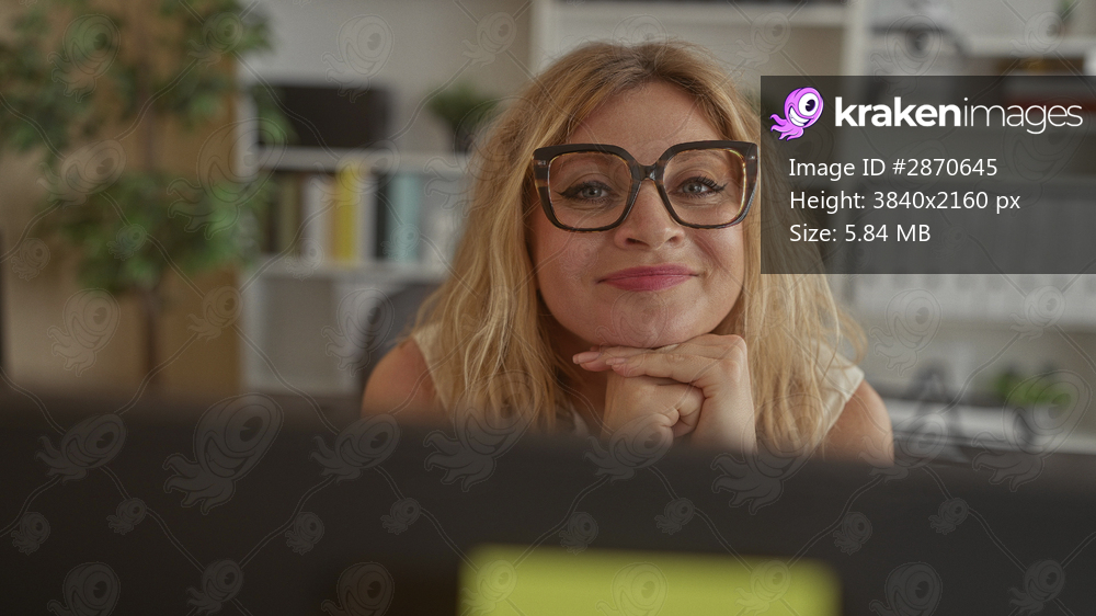 Woman with glasses resting hands under chin at office desk, smiling gently while looking aside; thoughtful career reflection.