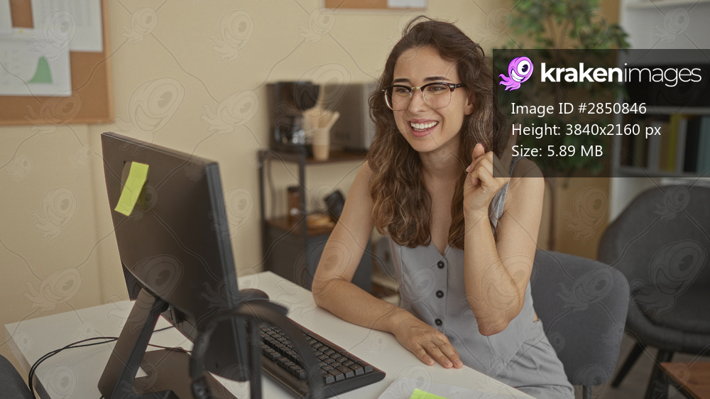 Woman with glasses resting her hand on chin while gazing at computer screen in an office building; curiosity insight.
