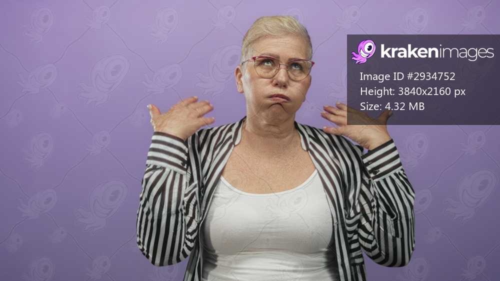 Woman with glasses short blonde hair wearing striped shirt and white tank top raising both hands to ears while pouting and looking up in purple studio; frustration. - Kraken Images