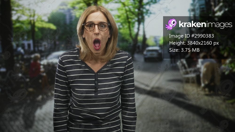 Woman with glasses showing hands raised and open mouth gesture on busy street cafe terrace with blurred diners and bikes; surprise reaction.