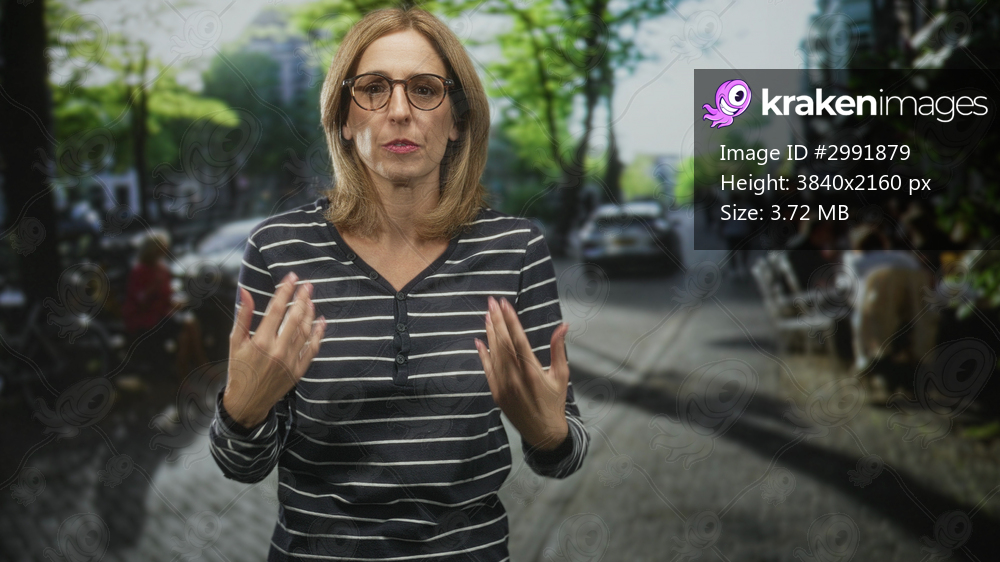 Woman with glasses showing hands raised and open mouth gesture on busy street cafe terrace with blurred diners and bikes; surprise reaction.