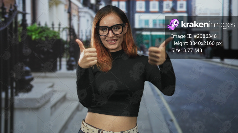 Woman with glasses showing thumbs up and exposed midriff on a street lined with buildings and railings; confidence success.