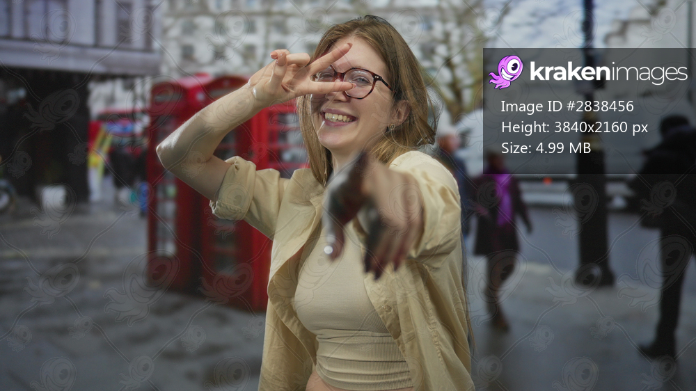 Woman with glasses shows hand in peace sign gesture toward camera on city street with red phone booths in background; joy.