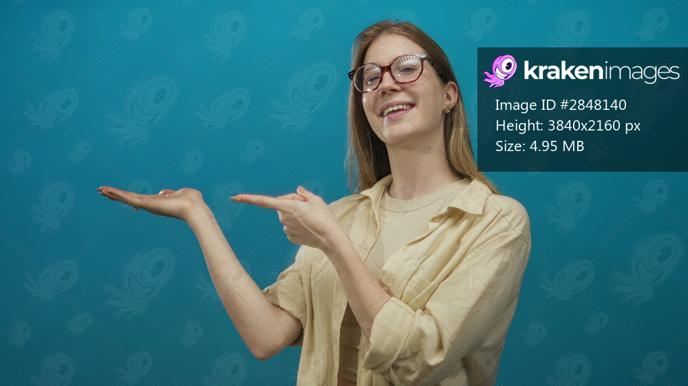 Woman with glasses shows open palm and finger pointing to object in a blue studio setting; invitation.