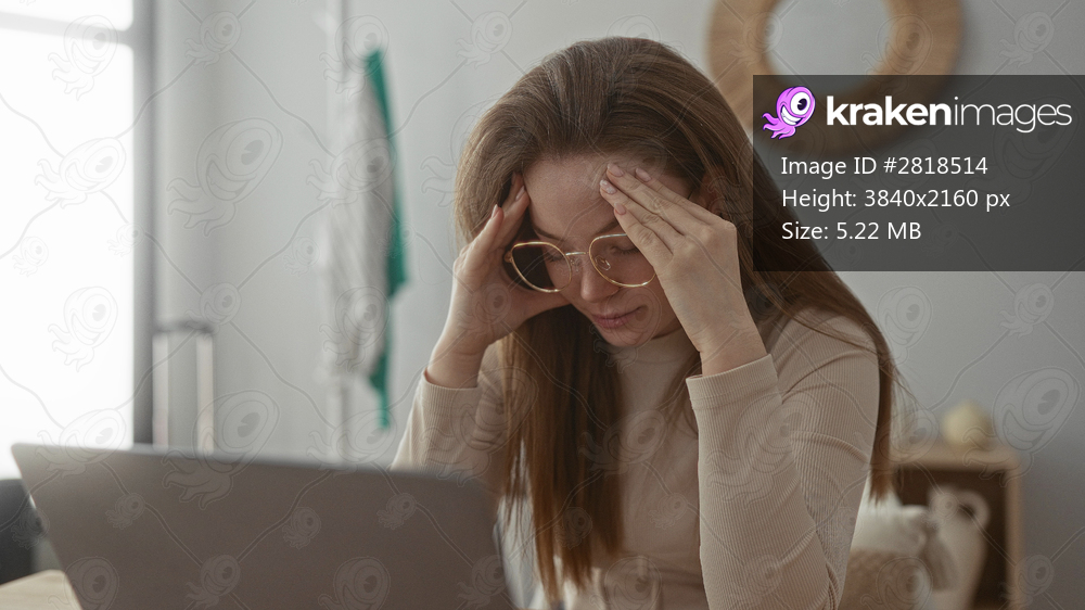 Woman with glasses sitting at a wooden desk pressing her temples while staring at a laptop screen in studio; stress fatigue frustration focus.