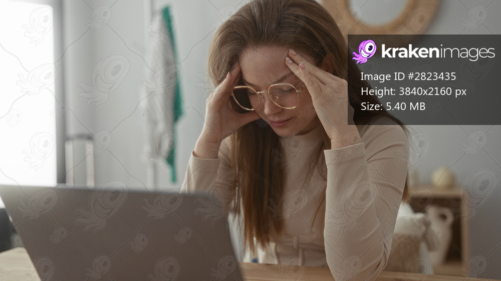 Woman with glasses sitting at a wooden desk pressing her temples while staring at a laptop screen in studio; stress fatigue frustration focus.