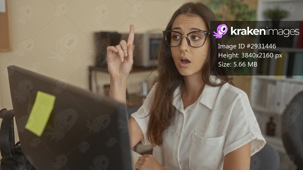 Woman with glasses sitting at desk with hand on chin and pointing finger near computer monitor in building; confusion doubt.