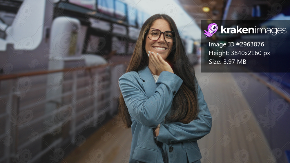 Woman with glasses smiles, arms crossed and hand near chin while standing in a building corridor with wooden deck and metal railing; confidence.