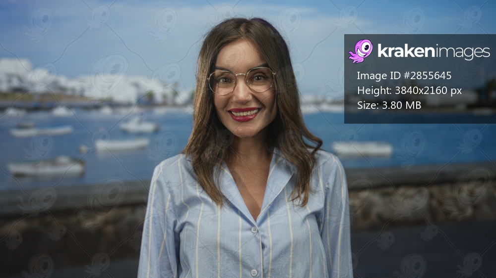Woman with glasses smiles broadly at camera by moored white boats in a sunny seaside port wearing a light blue shirt; happiness.