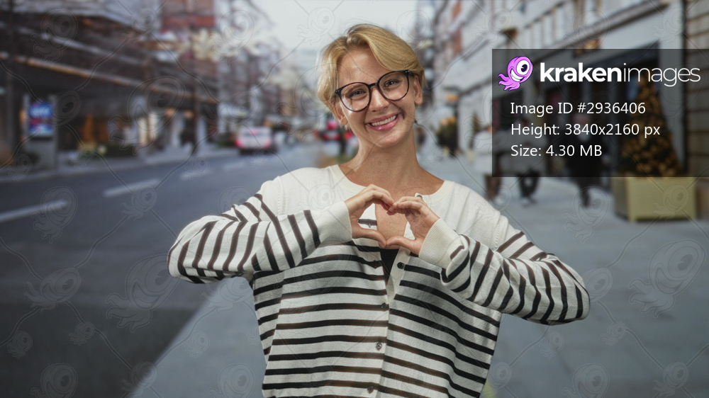 Woman with glasses smiles and forms heart with hands on a city street in front of shops and a christmas tree; warmth joy.
