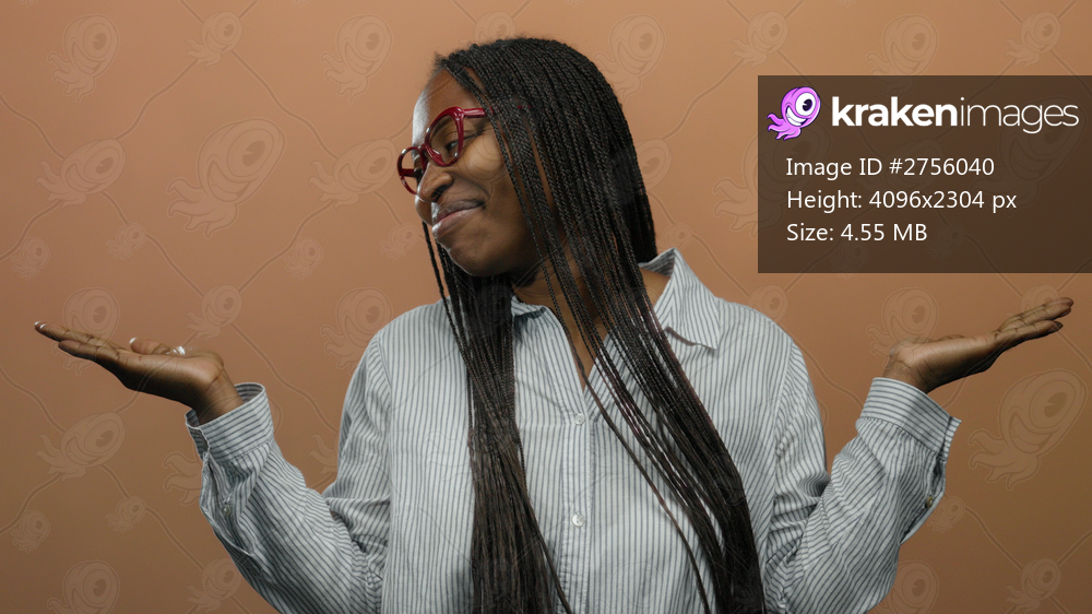Woman with glasses smiles joyfully with outstretched arms against a soft brown background, highlighting her braided hair and striped shirt.