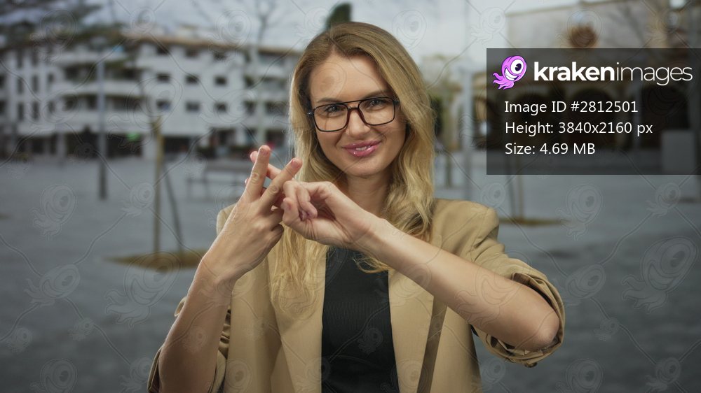 Woman with glasses smiles on urban street making hashtag gesture with fingers in outdoor city setting displaying a modern blend of style and digital communication - Kraken Images