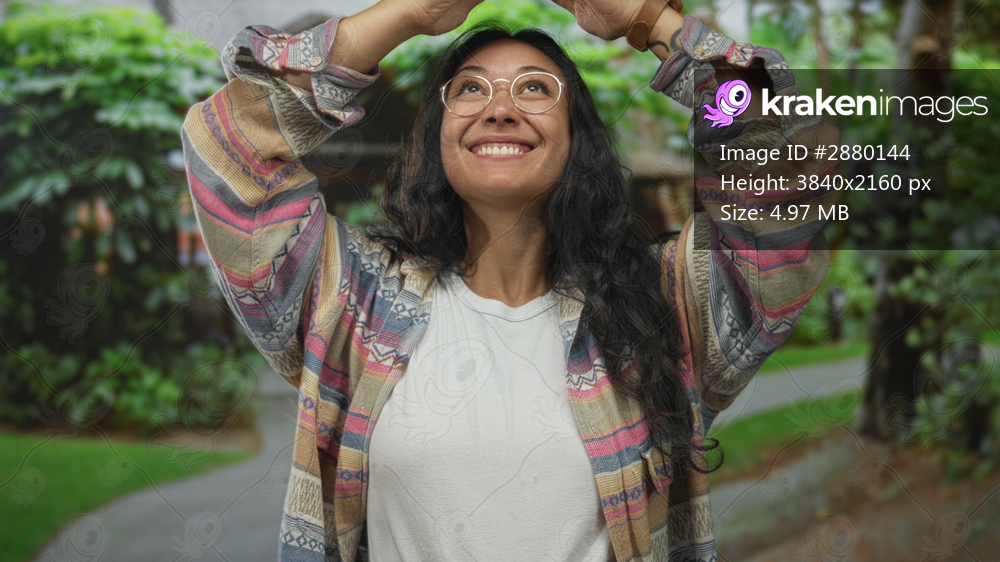 Woman with glasses smiles and raises hands above head while standing on a leafy forest path wearing a white tee and patterned jacket; joy wonder.