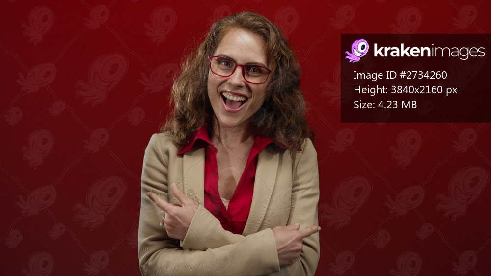 Woman with glasses smiling and giving thumbs up against a vibrant red wall, showcasing excitement and joy in a professional setting.