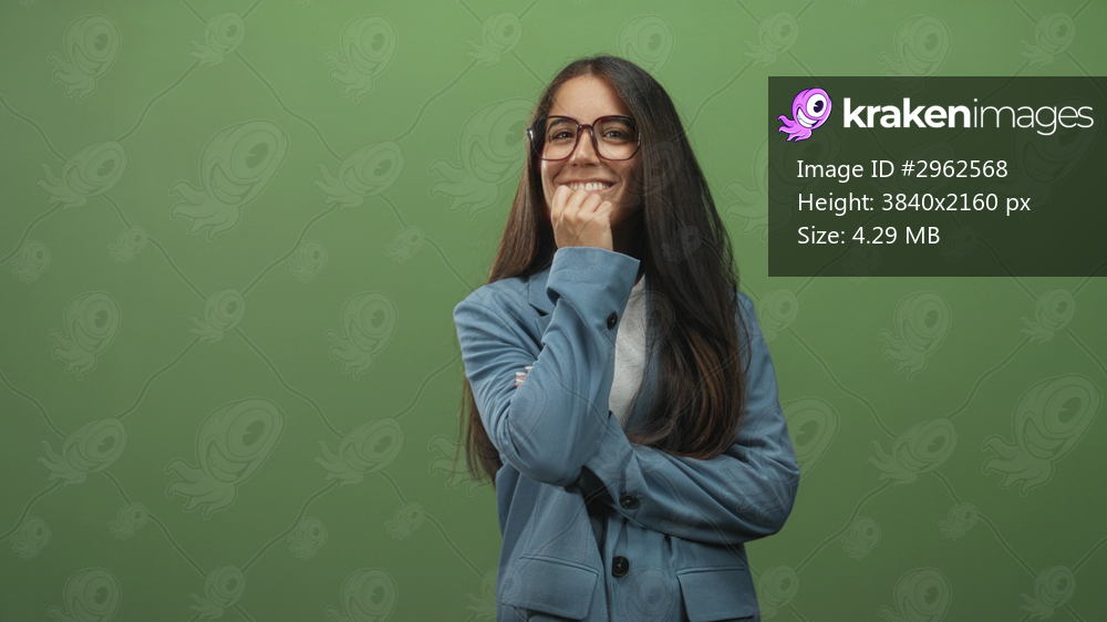 Woman with glasses smiling, hand to mouth and arms crossed wearing blue blazer in a green studio; confidence charm.