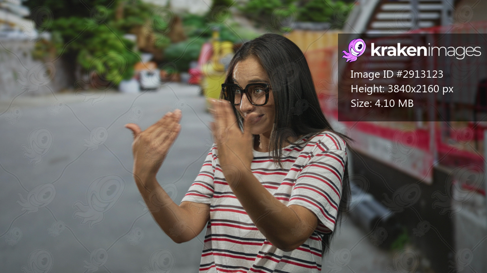 Woman with glasses smiling and hands gesturing on street wearing white and red striped t shirt and large eyeglasses; joy casual conversation.