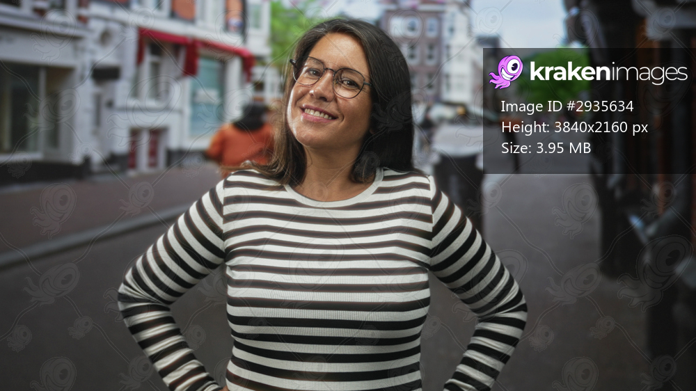 Woman with glasses smiling, hands on hips, wearing a striped shirt on a street in a city; confidence ease.