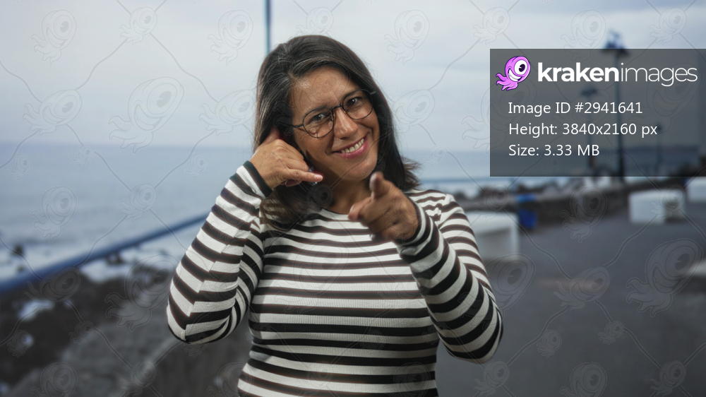 Woman with glasses smiling, making call me hand gesture and pointing with finger on a coastal street promenade with lampposts and benches; playful invitation. - Kraken Images