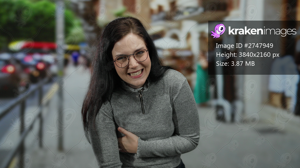 Woman with glasses smiling on a busy street wearing grey sweater surrounded by urban traffic and cityscapes outdoors during daytime