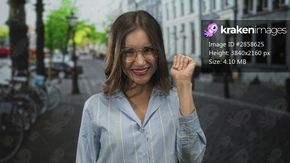 Woman with glasses smiling and puckering lips wearing blue striped shirt on a city cobbled street near parked bicycles and white buildings; playful confidence. - Kraken Images