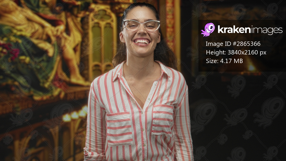Woman with glasses smiling softly before an ornate altar in a catholic church setting; spiritual joy.