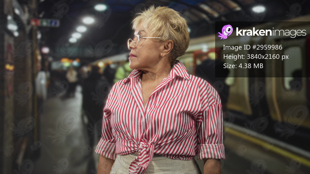 Woman with glasses smiling, wearing a red and white striped blouse tied at the waist on a subway platform inside a building; cheerful confidence.