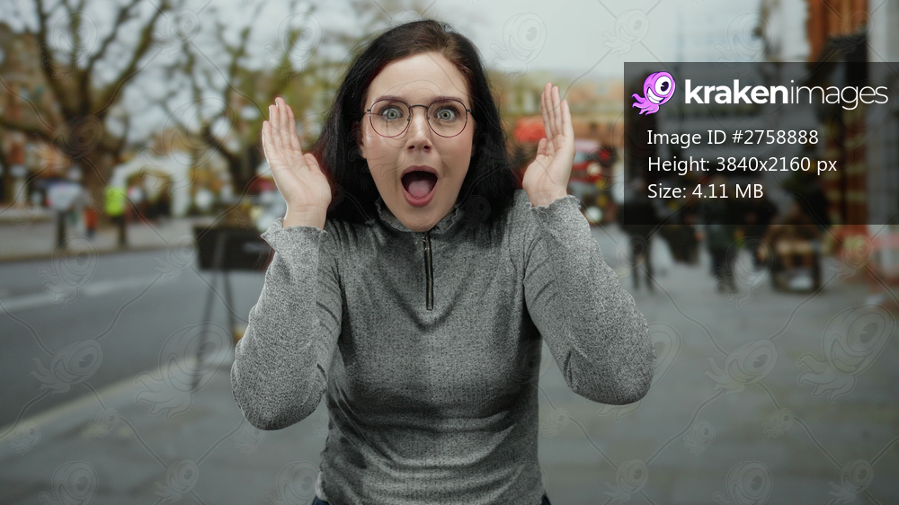Woman with glasses smiling while sitting on a busy street filled with cars and people, showcasing a playful expression and joyful atmosphere during the day. - Kraken Images