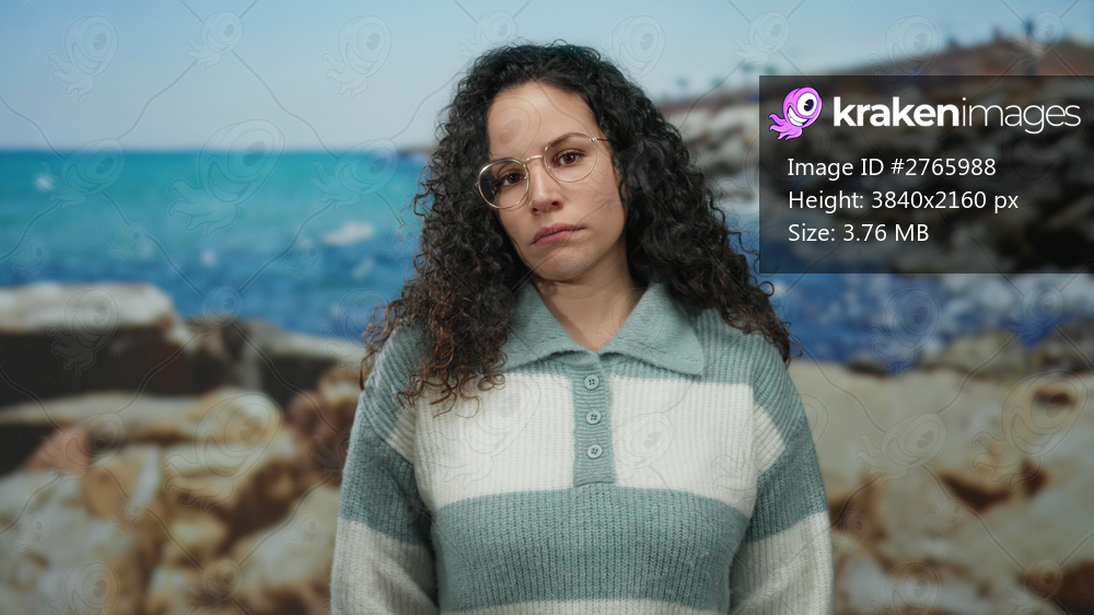 Woman with glasses standing at a rocky beach with bright blue sea under a clear sky, exuding a serene yet contemplative mood.