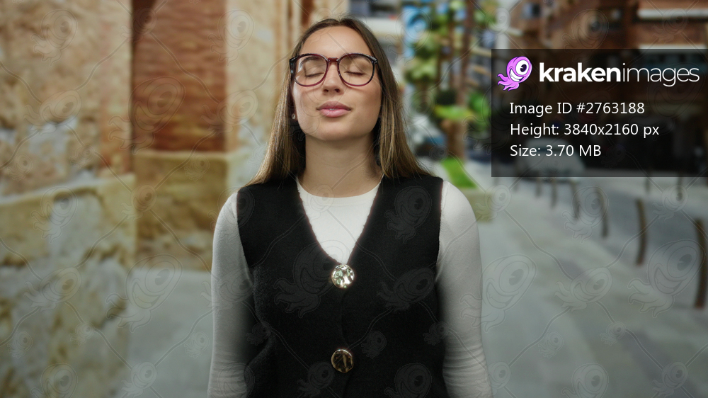 Woman with glasses standing on a sunny street outdoors, smiling, eyes closed, enjoying the breeze, with a blurred background of urban brick buildings and cars passing by. - Kraken Images